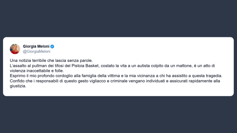 Il presidente del Consiglio, Giorgia Meloni, ha scritto su X: «Una notizia terribile che lascia senza parole. L’assalto al pullman dei tifosi del Pistoia Basket, costato la vita a un autista colpito da un mattone, è un atto di violenza inaccettabile e folle». Il capo del Governo ha poi espresso «profondo cordoglio» alla famiglia della vittima e «la mia vicinanza a chi ha assistito a questa tragedia.