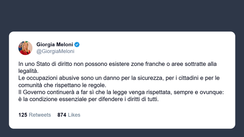 Il presidente del Consiglio, Giorgia meloni, ha affermato in un post su X che in uno Stato di diritto «non possono esistere zone franche o aree sottratte alla legalità». Le occupazioni abusive, prosegue la Meloni, sono un «danno per la sicurezza e per i cittadini che rispettano le regole». Il Governo continuerà a far sì che la legge «venga rispettata», sempre e ovunque: «è la condizione essenziale per difendere i diritti di tutti», ha concluso.