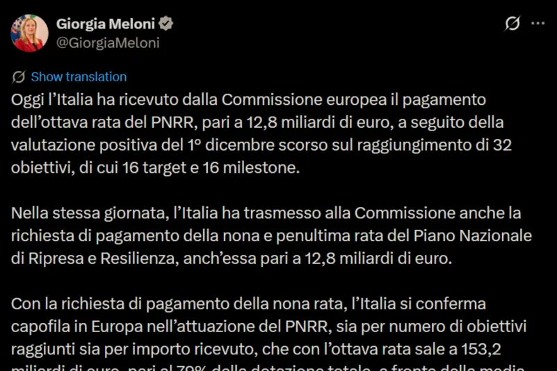 Il presidente del Consiglio Giorgia Meloni ha scritto su X: «oggi l’Italia ha ricevuto dalla Commissione europea il pagamento dell’ottava rata del Pnrr, pari a 12 miliardi e 800 milioni di euro, a seguito della valutazione positiva del 1° dicembre scorso sul raggiungimento di 32 obiettivi, di cui 16 target e 16 milestone. Nella stessa giornata, l’Italia ha trasmesso alla Commissione anche la richiesta di pagamento della nona e penultima rata del Piano nazionale di ripresa e resilienza, anch’essa pari a 12 miliardi e 800 milioni. Con la richiesta di pagamento della nona rata, l’Italia si conferma capofila in Europa nell’attuazione del Pnrr, sia per numero di obiettivi raggiunti sia per importo ricevuto, che con l’ottava rata sale a 153 miliardi e 200 milioni di euro, pari al 79% della dotazione totale, a fronte della media europea del 60%. Nel 2026 il Governo, insieme alle istituzioni competenti, continuerà a lavorare con determinazione per completare gli obiettivi della decima e ultima rata, trasformando il Piano più complesso d’Europa in risultati concreti per cittadini, imprese, economia e per la credibilità internazionale della Nazione».