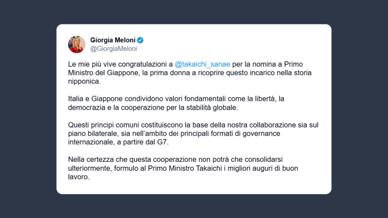 Il presidente del Consiglio, Giorgia Meloni, ha scritto su X: «le mie più vive congratulazioni a Takaichi Sanae per la nomina a primo ministro del Giappone, la prima donna a ricoprire questo incarico nella storia nipponica. Italia e Giappone condividono valori fondamentali come la libertà, la democrazia e la cooperazione per la stabilità mondiale». «Questi principi comuni – ha concluso la Meloni – costituiscono la base della nostra collaborazione sia sul piano bilaterale, sia nell’ambito dei principali formati di governance internazionale, a partire dal G7. Nella certezza che questa cooperazione non potrà che consolidarsi ulteriormente, formulo al Primo Ministro Takaichi i migliori auguri di buon lavoro».