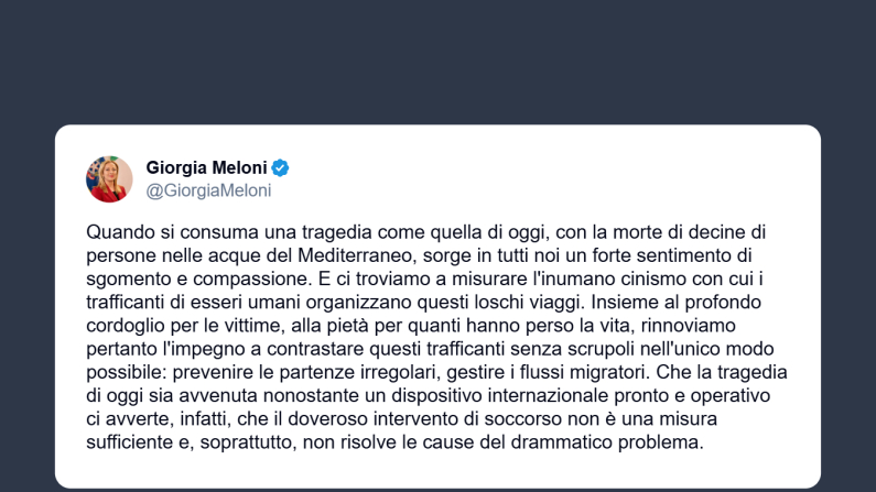 Il presidente del Consiglio, Giorgia Meloni, ha commentato ieri in un post su X la tragedia del naufragio di Lampedusa che ha causato la morte di 27 persone. Quando si «consuma una tragedia come quella di oggi […] sorge in tutti noi un forte sentimento di sgomento e compassione».