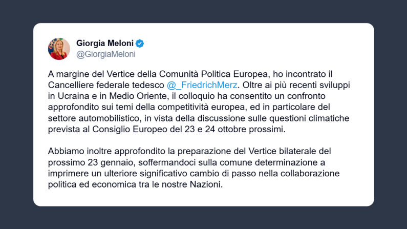 Il presidente del Consiglio, Giorgia Meloni, ha scritto su X: «a margine del Vertice della Comunità Politica Europea, ho incontrato il Cancelliere federale tedesco Friedrich Merz. Oltre ai più recenti sviluppi in Ucraina e in Medio Oriente, il colloquio ha consentito un confronto approfondito sui temi della competitività europea, ed in particolare del settore automobilistico, in vista della discussione sulle questioni climatiche prevista al Consiglio Europeo del 23 e 24 ottobre prossimi». É stata inoltre «approfondita la preparazione del Vertice bilaterale del prossimo 23 gennaio, soffermandoci sulla comune determinazione a imprimere un ulteriore significativo cambio di passo nella collaborazione politica ed economica tra le nostre Nazioni».