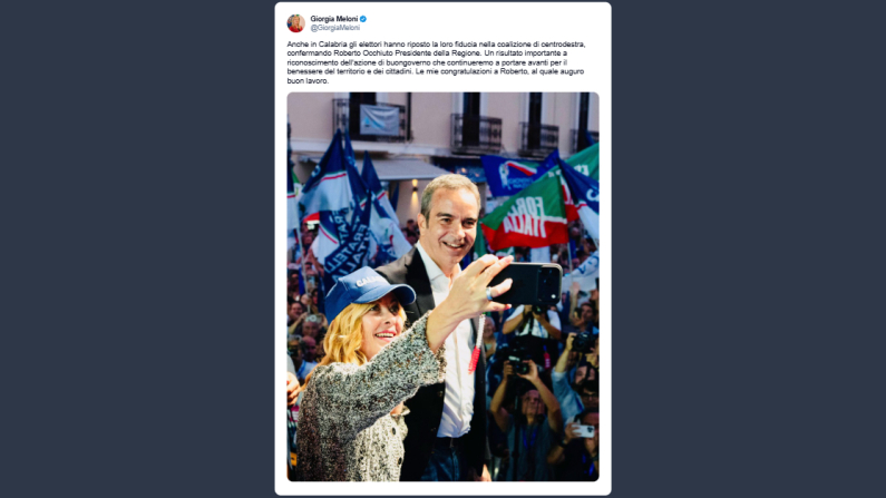 Il presidente del Consiglio, Giorgia Meloni, ha scritto su X: «Anche in Calabria gli elettori hanno riposto la loro fiducia nella coalizione di centrodestra, confermando Roberto Occhiuto Presidente della Regione». Un risultato importante, dice la Meloni, a «riconoscimento dell’azione di buongoverno che continueremo a portare avanti per il benessere del territorio e dei cittadini».