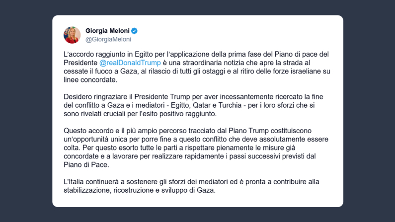 «L’accordo raggiunto in Egitto per l’applicazione della prima fase del Piano di pace del Presidente Donald Trump è una straordinaria notizia che apre la strada al cessate il fuoco a Gaza, al rilascio di tutti gli ostaggi e al ritiro delle forze israeliane su linee concordate. Desidero ringraziare il Presidente Trump per aver incessantemente ricercato la fine del conflitto a Gaza e i mediatori – Egitto, Qatar e Turchia – per i loro sforzi che si sono rivelati cruciali per l’esito positivo raggiunto. Questo accordo e il più ampio percorso tracciato dal Piano Trump costituiscono un’opportunità unica per porre fine a questo conflitto che deve assolutamente essere colta. Per questo esorto tutte le parti a rispettare pienamente le misure già concordate e a lavorare per realizzare rapidamente i passi successivi previsti dal Piano di Pace».