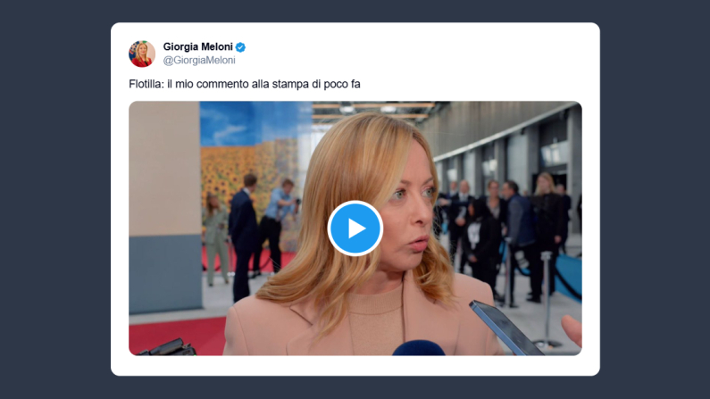 Il presidente del Consiglio, Giorgia Meloni, ha dichiarato che le operazioni di abbordaggio sono ancora in corso, con «l’unità di crisi della Farnesina che stanotte è stata in contatto con gli avvocati di alcuni degli imbarcati e ovviamente faremo il possibile perché queste persone possano tornare in Italia al più presto». Il capo del Governo ha comunque ribadito di continuare a ritenere che questo non porti «alcun beneficio al popolo della Palestina, in compenso mi pare di capire che porterà molti disagi al popolo italiano, lo stesso popolo italiano che ancora ieri veniva ringraziato dai palestinesi per il lavoro che sta facendo». Siamo la nazione non islamica – prosegue la Meloni – che ha «evacuato più persone dalle case per essere curate nei propri ospedali e siamo una delle prime nazioni al mondo per consegna di aiuti».