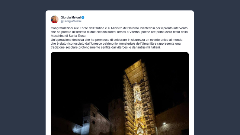 Il presidente del Consiglio, Giorgia Meloni, ha fatto le sue congratulazioni su X alle Forze dell’Ordine e al ministro dell’Interno Piantedosi per il pronto «intervento che ha portato all’arresto di due cittadini turchi armati a Viterbo, poche ore prima della festa della Macchina di Santa Rosa». L’operazione ha permesso di sventare l’attentato dei due cittadini turchi e di celebrare così in sicurezza l’evento unico al mondo, che è stato riconosciuto dall’Unesco – prosegue la Meloni – come «patrimonio immateriale dell’Umanità».