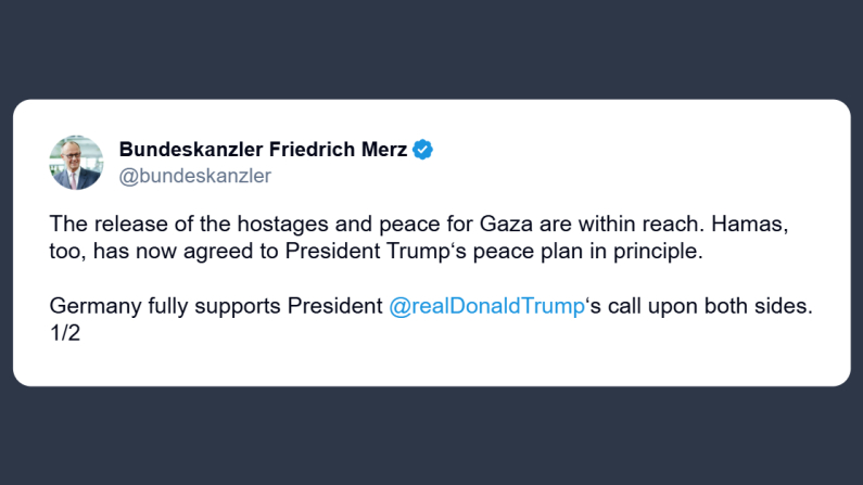 The release of the hostages and peace for Gaza are within reach. Hamas, too, has now agreed to President Trump‘s peace plan in principle. Germany fully supports President @realDonaldTrump ‘s call upon both sides. 1/2