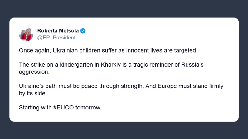 Il presidente del Parlamento europeo, Roberta Metsola, ha scritto ieri su X: «ancora una volta, sono presi di mira bambini ucraini innocenti. L’attacco a un asilo di Kharkiv è un tragico promemoria dell’aggressione russa. La via dell’Ucraina deve essere pace con la forza. L’Europa è al suo fianco, a partire dal Consiglio europeo».