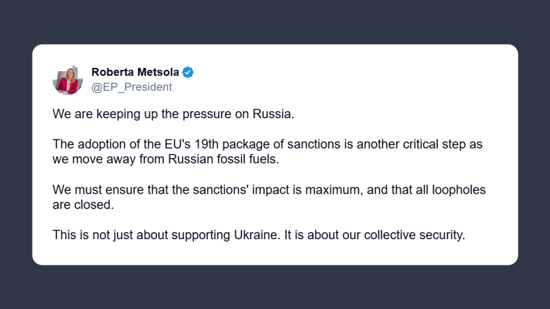 «Manteniamo la pressione sulla Russia. L’adozione del diciannovesimo pacchetto di sanzioni dell’Unione Europea rappresenta un ulteriore passo cruciale per ridurre la dipendenza dai combustibili fossili russi. Occorre garantire che l’impatto delle sanzioni sia massimo e che ogni possibile scappatoia venga chiusa. Non si tratta solo di sostenere l’Ucraina, ma di tutelare la nostra sicurezza collettiva».