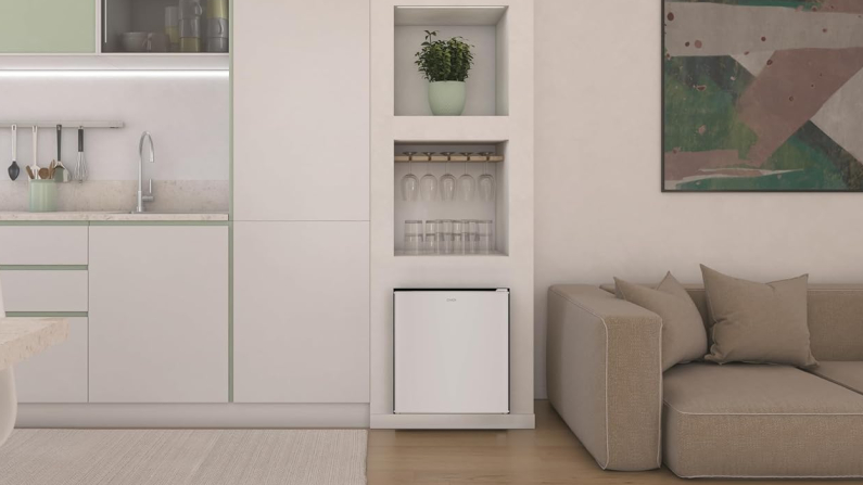 Candy Chasd, il mini frigo da 42 litri che sembra fatto apposta per chi ha poco spazio e non vuole rinunciare a un po’ di fresco tutto suo. Parliamo di un cubetto bianco pulitissimo (51 × 44,5 × 47,5 cm) con maniglia integrata, che sta ovunque: in camera, in ufficio, in taverna, garage, sotto la scrivania, sul mobile del soggiorno, persino in camper.