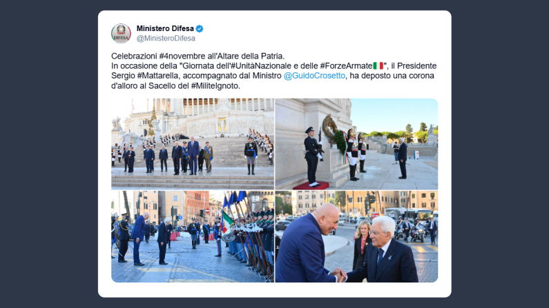 Il ministero della Difesa ha scritto su X: «Celebrazioni 4 novembre all’Altare della Patria. In occasione della “Giornata dell’Unità Nazionale e delle Forze Armate italiane”, il Presidente Sergio Mattarella, accompagnato dal Ministro Guido Crosetto, ha deposto una corona d’alloro al Sacello del Milite Ignoto».
