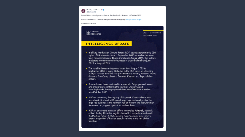 Il ministero della Difesa del Regno Unito ha riportato su X l’ultimo aggiornamento dei Servizi di difesa sulla situazione in Ucraina il 16 ottobre 2025. «È probabile che l’esercito russo abbia conquistato circa 250 km² di territorio ucraino a settembre, un calo significativo rispetto ai circa 465 km² presi ad agosto. Questo segue una riduzione graduale, mese per mese, del terreno conquistato da giugno ad agosto 2025». Il ministero ha poi evidenziato che «la notevole diminuzione del terreno conquistato da agosto a settembre 2025 è verosimilmente dovuta al fatto che [i russi ndr] stanno concentrando le proprie divisioni, in particolare quelle aviotrasportate, lungo la linea del fronte, spostandole dalle regioni di Sumy a quelle di Donetsk, Kherson e Zaporizhzhia».