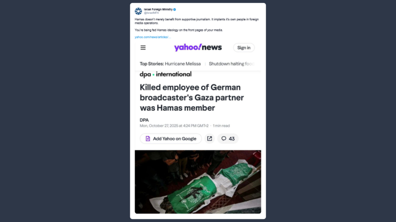 Il ministero degli Esteri israeliano ha scritto su X: «Hamas non si limita a trarre vantaggio da un giornalismo compiacente. Inserisce propri uomini nelle redazioni dei media stranieri. Vi stanno servendo l’ideologia di Hamas in prima pagina sui vostri giornali».