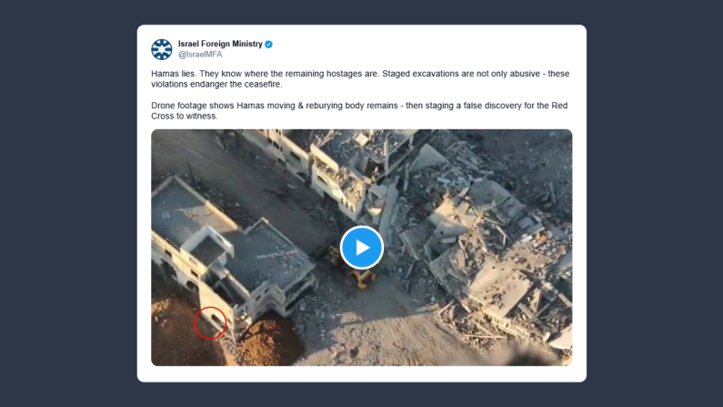 Il ministero degli Esteri israeliano ha scritto su X: «Hamas mente. Sa dove si trovano gli ostaggi ancora in vita. Le messe in scena degli scavi non sono solo abusive, ma queste violazioni mettono a rischio il cessate il fuoco. Le riprese dal drone mostrano Hamas spostare e seppellire nuovamente resti umani, per poi inscenare una falsa scoperta da far osservare alla Croce Rossa».