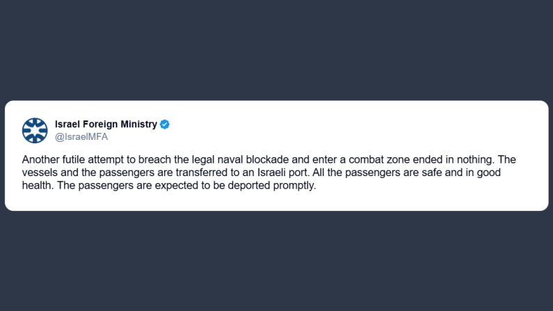 Il ministero degli Esteri israeliano ha scritto in un post su X: «Un ulteriore sforzo vano di forzare il blocco navale legale e accedere a una zona di combattimento si è concluso senza esito». Le imbarcazioni e i passeggeri sono stati trasferiti in un porto israeliano, e il ministero ha sottolineato che tutti i passeggeri «sono incolumi e in buone condizioni di salute e verranno rimpatriati a breve».