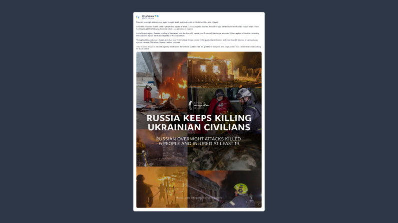 Il ministero degli Esteri ucraino ha scritto su X: «gli attacchi notturni della Russia hanno portato ancora una volta morte e distruzione in città e villaggi ucraini. A Kharkiv i droni russi hanno ucciso quattro persone e ne hanno ferite almeno 13, tra cui due bambini. Nella regione di Kharkiv circa 60 maiali sono morti nell’incendio di un capannone agricolo provocato dall’attacco russo; una persona è rimasta ferita. Nel distretto di Dnipro il bombardamento russo su Marhanets ha tolto la vita a due persone e ne ha ferite altre cinque tra i civili. Altre regioni ucraine, compresa quella di Chernihiv, sono state colpite dagli attacchi russi. Nell’ultima settimana la Russia ha lanciato contro l’Ucraina oltre 1.050 droni d’attacco, quasi mille bombe aeree guidate e più di 60 missili di vario tipo. Anche in questi giorni i raid russi proseguono. Vanno fermati. L’Ucraina ha urgente bisogno di nuovi sistemi di difesa aerea. Siamo grati a tutti coloro che aiutano a proteggere vite umane e a quanti lavorano per una pace giusta».