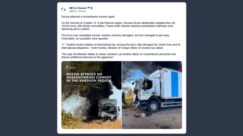 Il ministero degli Esteri ucraino ha scritto ieri su X: «La Russia ha nuovamente attaccato una missione umanitaria. La mattina del 14 ottobre, nella regione di Kherson, le forze russe hanno volutamente preso di mira con droni e artiglieria quattro camion dell’Ufficio delle Nazioni Unite per il coordinamento degli affari umanitari. I veicoli, di colore bianco e contrassegnati da simboli umanitari, stavano consegnando aiuti ai civili. Un camion è stato completamente distrutto dalle fiamme, un altro gravemente danneggiato, mentre due sono riusciti a sfuggire. Fortunatamente, non sono state riportate vittime».