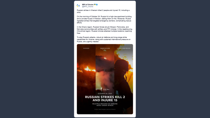 Il ministero degli Esteri ucraino, Andrij Sybiha, ha scritto su X: «Gli attacchi russi a Kherson hanno causato la morte di 2 persone e il ferimento di 15, tra cui un bambino. La mattina del 24 ottobre, la Russia ha colpito un palazzo di appartamenti e una casa privata a Kherson, incendiandoli. Inoltre, la Russia ha ripetuto attacchi che hanno preso di mira i soccorritori, complicando le operazioni di soccorso. Nella regione di Dnipro, le forze russe hanno colpito le comunità di Nikopol, Pokrovska e Myrivska con artiglieria e droni Fpv». Per fermare gli attacchi russi, ha ribadito Sybiha, «urge avere una robusta difesa aerea e missili a lungo raggio per l’Ucraina, insieme a una pressione internazionale sostenuta sulla Russia».