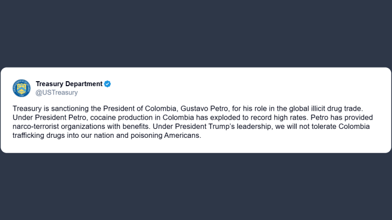 Il ministero del Tesoro americano ha scritto ieri su X: «abbiamo imposto sanzioni al presidente della Colombia, Gustavo Petro, per il suo ruolo nel traffico mondiale di droga. Sotto la presidenza di Petro, la produzione di cocaina in Colombia ha raggiunto livelli record. Petro ha offerto benefici alle organizzazioni narco terroristiche. Sotto la guida del presidente Donald Trump, non tollereremo che la Colombia traffichi droga nel nostro Paese, avvelenando gli americani».