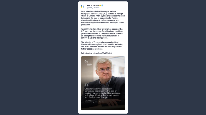 «In un’intervista al quotidiano norvegese Verdens Gang, il ministro degli Esteri ucraino Andrii Sybiha ha sottolineato la necessità di alzare il prezzo dell’aggressione per la Russia, potenziare i sistemi di difesa aerea dell’Ucraina e garantire la fornitura di armi e fondi per la produzione di droni. Andrii Sybiha ha dichiarato che l’Ucraina ha accolto la proposta degli Usa per un cessate il fuoco senza condizioni, ma la Russia prosegue con massicci attacchi nel tentativo di ostacolare gli sforzi internazionali per una pace giusta e duratura. Il ministro degli Esteri ha ribadito che l’Ucraina non accetterà mai la perdita dei propri territori e che il cessate il fuoco deve rappresentare il passo successivo verso ulteriori negoziati di pace».