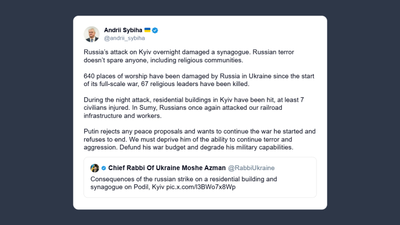 Il ministro degli Esteri ucraino, Andrii Sybiha, ha scritto oggi su X: «l’attacco notturno della Russia su Kiev ha danneggiato una sinagoga. Il terrorismo russo non risparmia nessuno, nemmeno le comunità religiose. Dall’inizio della guerra su larga scala, la Russia ha danneggiato 640 luoghi di culto in Ucraina e 67 leader religiosi sono stati uccisi».