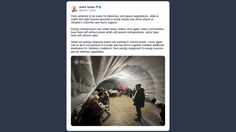 «Putin finge di essere pronto per la diplomazia e i negoziati di pace, ma nella realtà questa notte la Russia ha lanciato un brutale attacco missilistico e con droni contro le regioni di Chernihiv e Sumy, in Ucraina. Le infrastrutture energetiche sono state nuovamente colpite duramente. Molte comunità sono rimaste senza elettricità in pieno autunno freddo, alcune anche senza acqua. Mentre le nostre squadre di emergenza lavorano per ripristinare l’energia, rinnovo l’appello a tutti i nostri partner in Europa e oltre affinché mobilitino con urgenza ulteriore assistenza per la resilienza dell’Ucraina: da attrezzature energetiche a fonti di energia e capacità di difesa aerea».