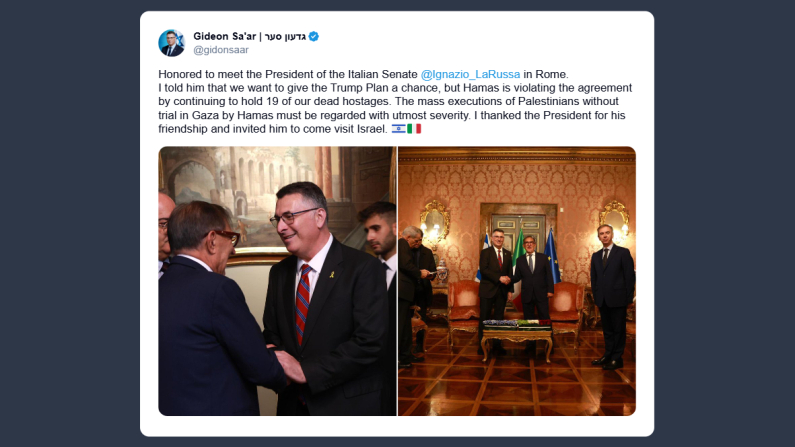 Il ministro degli Esteri israeliano, Gideon Sa’ar, ha scritto su X: «É stato un onore incontrare a Roma il presidente del Senato italiano, Ignazio La Russa. Gli ho detto che vogliamo dare una possibilità al piano Trump, ma Hamas sta violando l’accordo trattenendo ancora 19 dei nostri ostaggi deceduti». Gideon ha poi evidenziato che «le esecuzioni di massa di palestinesi senza processo a Gaza da parte di Hamas devono essere considerate con la massima gravità. Ho ringraziato il presidente per la sua amicizia e l’ho invitato a visitare Israele».