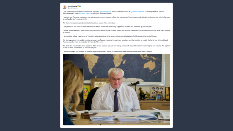 Il ministro degli Esteri ucraino Andriy Sybiha ha scritto su X: «ho avuto un colloquio importante con i nostri alleati di Germania (Johann Wadephul), Regno Unito (Yvette Cooper), Francia (Jean-Noël Barrot), Finlandia (Elina Valtonen), Italia (Antonio Tajani) e Polonia (Radosław Sikorski). Ho aggiornato i partner europei sugli ultimi sviluppi degli sforzi di pace, sull’esito dei colloqui di ieri a Ginevra, che sono stati concreti e produttivi, e sul ruolo decisivo dell’Europa. Abbiamo condiviso valutazioni e coordinato le posizioni in vista dei prossimi passi. Ringrazio gli alleati per la conferma del loro sostegno fermo e incondizionato all’Ucraina e al presidente Volodymyr Zelensky. L’Ucraina apprezza gli sforzi di pace degli Stati Uniti e del presidente Donald Trump e resta impegnata a lavorare in modo costruttivo e attivo per porre fine alla guerra. Ho sottolineato l’importanza cruciale di preservare l’unità transatlantica per ottenere una pace duratura e giusta per l’Ucraina e per l’intera Europa. Ci siamo trovati d’accordo sulla necessità di mantenere la pressione sulla Russia, anche attraverso nuove sanzioni e la decisione di consentire l’uso integrale dei beni russi immobilizzati, misura che va adottata entro la fine dell’anno. Condividiamo l’obiettivo principale del processo di pace, una soluzione giusta e stabile che rispetti la sovranità e la sicurezza dell’Ucraina. Abbiamo convenuto di restare in stretto coordinamento per raggiungerla. Ho inoltre incoraggiato i partner a valutare visite di alto livello in Ucraina, per dimostrare solidarietà e vicinanza al nostro popolo».