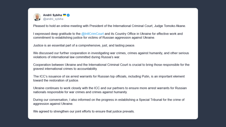 Il ministro degli Esteri ucraino Andriy Sybiha ha scritto su X: «piacere di aver tenuto un incontro online con il presidente della Corte penale internazionale, il giudice Tomoko Akane. Ho espresso profonda gratitudine alla Corte penale internazionale e al suo ufficio in Ucraina per l’efficace operato e l’impegno a garantire giustizia alle vittime dell’aggressione russa contro l’Ucraina. La giustizia è parte essenziale di una pace completa, giusta e duratura. Abbiamo discusso della nostra ulteriore cooperazione nelle indagini su crimini di guerra, crimini contro l’umanità e altre gravi violazioni del diritto internazionale commesse durante la guerra russa. La collaborazione tra Ucraina e Corte penale internazionale è cruciale per assicurare alla sbarra i responsabili dei più gravi crimini internazionali. L’emissione di sei mandati di arresto per alti funzionari russi, tra cui Putin, da parte della Corte rappresenta un passo importante verso il ristabilimento della giustizia».