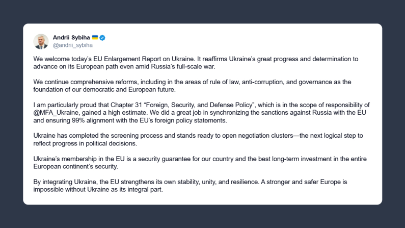Il ministro degli Esteri ucraino Andriy Sybiha ha scritto su X: «accogliamo con favore il rapporto sull’allargamento dell’Ue dedicato all’Ucraina. Conferma i grandi progressi e la determinazione dell’Ucraina a proseguire sul cammino europeo nonostante la guerra su larga scala della Russia. Proseguiamo con riforme approfondite, in particolare su Stato di diritto, lotta alla corruzione e governance, quali pilastri del nostro futuro democratico ed europeo. Sono particolarmente orgoglioso che il capitolo 31 politica estera, di sicurezza e di difesa, di competenza del ministero degli Esteri ucraino, abbia ottenuto una valutazione elevata. Abbiamo svolto un ottimo lavoro sincronizzando le sanzioni contro la Russia con quelle dell’Ue e raggiungendo un allineamento del 99% con le dichiarazioni di politica estera dell’Ue. L’Ucraina ha completato il processo di screening e è pronta ad aprire i cluster negoziali. Il passo successivo logico per tradurre i progressi in decisioni politiche. L’adesione dell’Ucraina all’Ue rappresenta una garanzia di sicurezza per il nostro Paese e il miglior investimento a lungo termine per la sicurezza dell’intero continente europeo. Integrando l’Ucraina, l’Ue rafforza la propria stabilità, unità e resilienza. Un’Europa più forte e sicura è impensabile senza l’Ucraina come parte integrante».