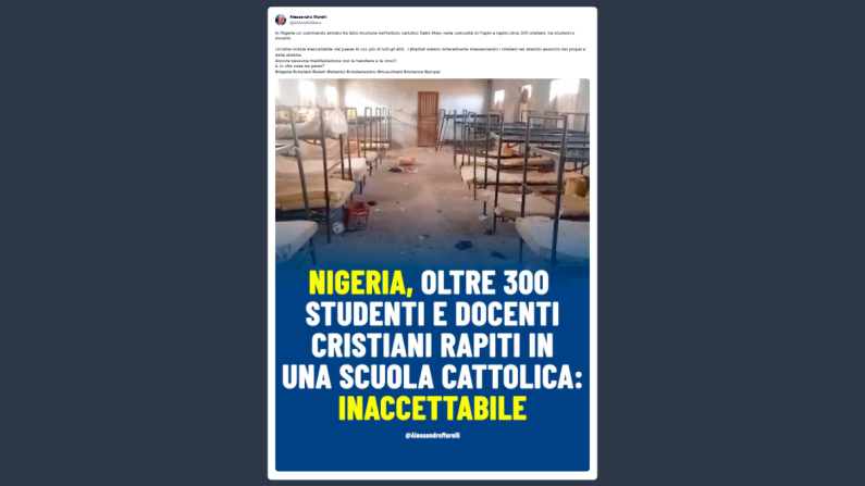 «In Nigeria un commando armato ha fatto irruzione nell’istituto cattolico Saint Mary nella comunità di Papiri e rapito circa 300 cristiani, tra studenti e docenti. Un’altra notizia inaccettabile dal Paese in cui, più di tutti gli altri, i jihadisti stanno letteralmente massacrando i cristiani nel silenzio assoluto dei propal e della sinistra. Ancora nessuna manifestazione con le bandiere e le croci?».