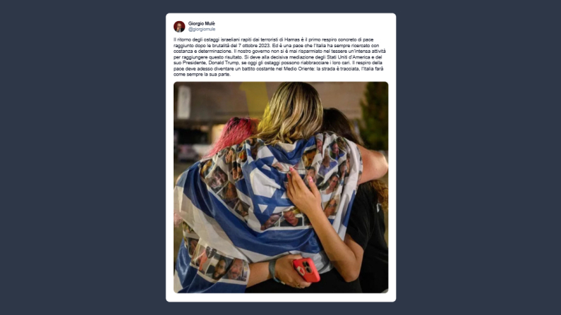 Il vicepresidente della Camera e deputato di Forza Italia, Giorgio Mulè, ha scritto su X: «Il ritorno degli ostaggi israeliani rapiti dai terroristi di Hamas è il primo respiro concreto di pace raggiunto dopo le brutalità del 7 ottobre 2023: una pace che l’Italia ha sempre ricercato con costanza e determinazione». Se oggi gli ostaggi possono riabbracciare i loro cari, spiega Mulè, «lo si deve alla decisiva mediazione degli Stati Uniti d’America e del suo Presidente, Donald Trump. Il respiro della pace deve adesso diventare un battito costante nel Medio Oriente: la strada è tracciata, l’Italia farà come sempre la sua parte».