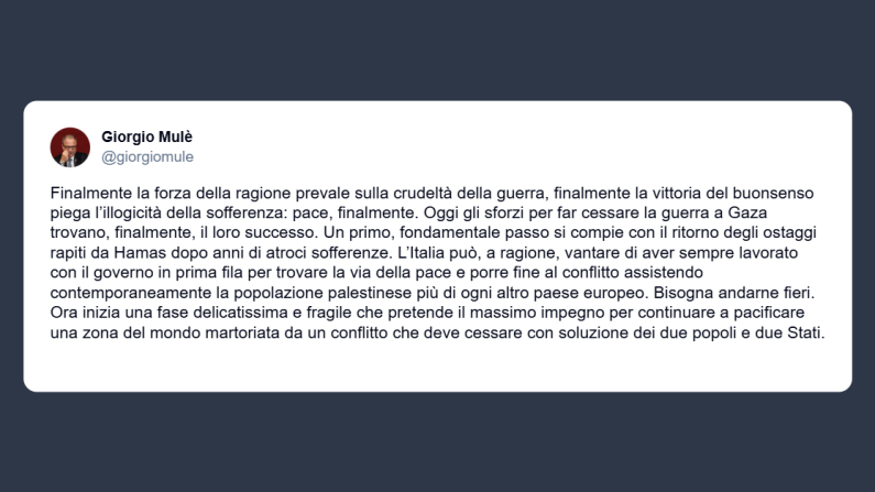 «Finalmente la forza della ragione prevale sulla crudeltà della guerra, finalmente la vittoria del buonsenso piega l’illogicità della sofferenza: pace». Lo ha dichiarato su X il vicepresidente della Camera e deputato di Forza Italia, Giorgio Mulè. «Oggi gli sforzi per far cessare la guerra a Gaza trovano, finalmente, il loro successo. Un primo, fondamentale passo si compie con il ritorno degli ostaggi rapiti da Hamas dopo anni di atroci sofferenze. L’Italia può, a ragione, vantare di aver sempre lavorato con il Governo in prima fila per trovare la via della pace e porre fine al conflitto assistendo contemporaneamente la popolazione palestinese più di ogni altro paese europeo». Per Mulè ora inizia una «fase delicatissima e fragile che pretende il massimo impegno per continuare a pacificare una zona del mondo martoriata da un conflitto che deve cessare con soluzione dei due popoli e due Stati».