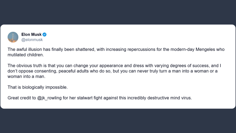 Elon Musk ha scritto su X: «L’illusione è finalmente crollata, con conseguenze reali per i “moderni Mengele” [medico nazista, ndr] che hanno mutilato bambini. È evidente che si possa modificare il proprio aspetto e abbigliamento, e non mi oppongo agli adulti consenzienti che lo fanno, ma non è possibile trasformare davvero un uomo in una donna o viceversa. Questa cosa è biologicamente impossibile. Va riconosciuto il merito a J.K. Rowling – conclude l’Ad di Tesla – per la sua strenua lotta contro questo virus mentale distruttivo».