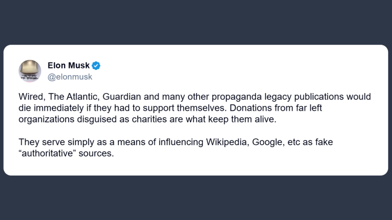 Elon Musk ha scritto su X: «Wired, The Atlantic, Guardian e molte altre testate giornalistiche di propaganda ereditate dal passato chiuderebbero immediatamente se dovessero mantenersi da sole. A tenerle in vita sono le donazioni di organizzazioni di estrema sinistra camuffate da enti benefici. Servono unicamente come strumento per influenzare Wikipedia, Google e simili, spacciandosi per fonti “autorevoli”».