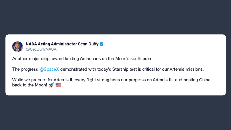 Il ministro dei Trasporti degli Stati Uniti e amministratore ad interim della Nasa, Sean Duffy, ha scritto su X: «É stato compiuto un altro passo significativo verso lo sbarco di americani al polo sud della Luna. I progressi dimostrati oggi da Spacex con il test di Starship sono cruciali per le nostre missioni “Artemis”. Mentre ci prepariamo per Artemis II, ogni volo rafforza il nostro cammino verso Artemis III e il nostro obiettivo di superare la Cina nel ritorno sulla Luna».