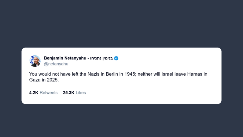 Il primo ministro israeliano Benjamin Netanyahu ha pubblicato ieri un post su X, dichiarando con fermezza la determinazione di Israele contro Hamas. «Non avreste lasciato i nazisti a Berlino nel 1945; allo stesso modo Israele non lascerà Hamas a Gaza nel 2025».
