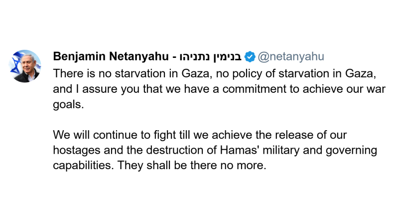 Il primo ministro israeliano Benjamin Netanyahu ha pubblicato un post su X in cui ha affermato che «non c’è nessuna carestia a Gaza». Ha poi ribadito l’impegno di Israele di «continuare a combattere» fino a quando non sarà raggiunto l’obiettivo di «liberare gli ostaggi e distruggere le capacità militari e di governo di Hamas» finché «non ci saranno più».