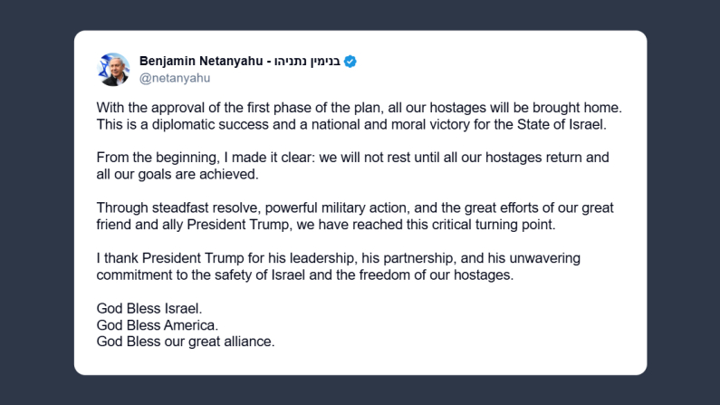 É grazie a una determinazione incrollabile e a una potente azione militare – spiega Netanyahu – e agli «straordinari sforzi del nostro grande alleato, il presidente Donald Trump, abbiamo raggiunto questo punto di svolta. Ringrazio il presidente Trump per la sua collaborazione e il suo impegno costante per la sicurezza di Israele e la liberazione dei nostri ostaggi».