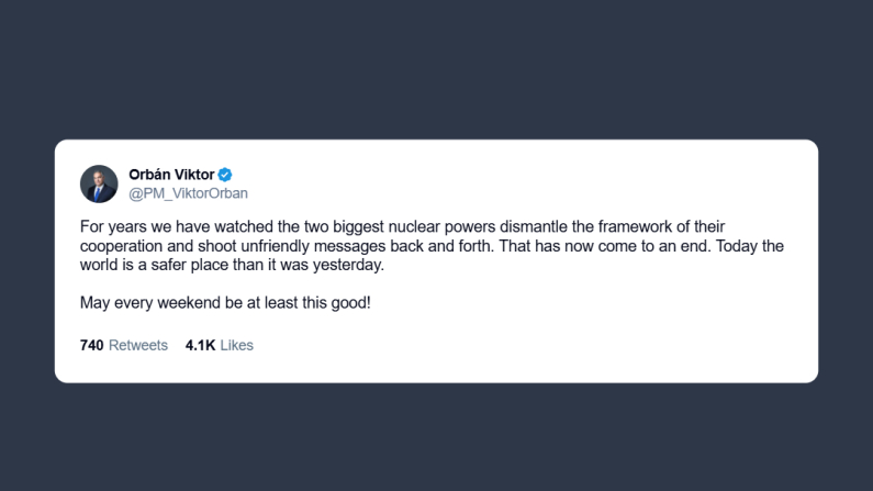 Il primo ministro ungherese Viktor Orbán ha pubblicato un post su X, commentando il recente vertice tra Stati Uniti e Russia in Alaska. «Per anni abbiamo visto le due maggiori potenze nucleari smantellare il quadro della loro cooperazione e scambiarsi messaggi ostili. Ma ora tutto questo è finito». Oggi il mondo, dice il presidente ungherese, è un «posto più sicuro di ieri». Orbán ha poi concluso augurando che «ogni fine settimana sia altrettanto buono».