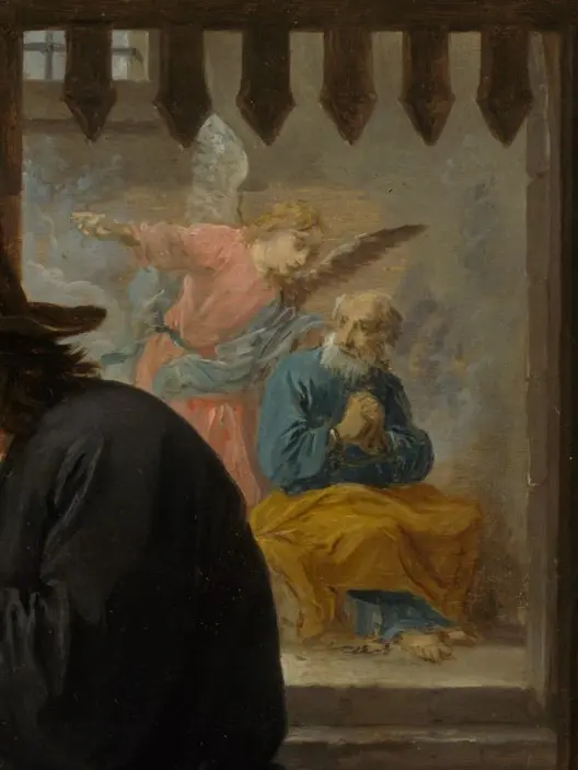 Per comprendere il dipinto di Teniers, dobbiamo conoscerne i retroscena. Pietro, uno dei primi discepoli di Gesù, viene arrestato e imprigionato dal re Erode per aver diffuso la verità e la bontà di Dio. In carcere viene accolto da un angelo che gli dice di fuggire. Pietro lo segue fino all’ingresso della prigione ed esce senza che nessuno lo noti.