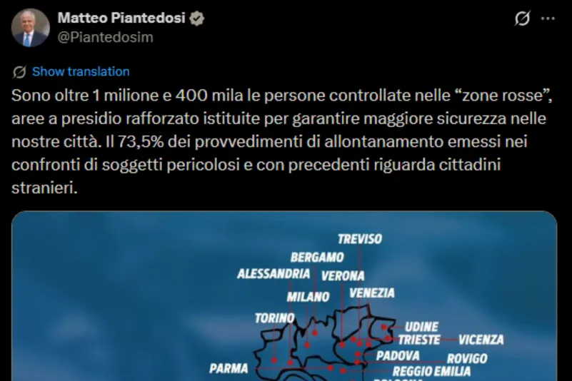 Il ministro dell’Interno Matteo Piantedosi ha scritto su X: «sono oltre 1 milione e 400 mila le persone controllate nelle “zone rosse”, aree a presidio rafforzato istituite per garantire maggiore sicurezza nelle nostre città. Il 73,5% dei provvedimenti di allontanamento emessi nei confronti di soggetti pericolosi e con precedenti riguarda cittadini stranieri».