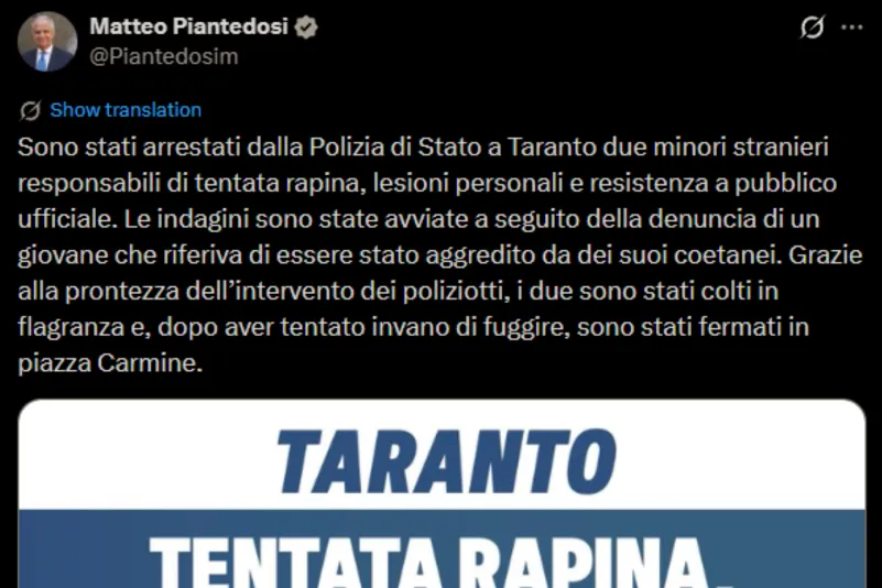 Il ministro dell’Interno Matteo Piantedosi ha scritto su X: «sono stati arrestati dalla Polizia di Stato a Taranto due minori stranieri responsabili di tentata rapina, lesioni personali e resistenza a pubblico ufficiale. Le indagini sono state avviate a seguito della denuncia di un giovane che riferiva di essere stato aggredito da dei suoi coetanei. Grazie alla prontezza dell’intervento dei poliziotti, i due sono stati colti in flagranza e, dopo aver tentato invano di fuggire, sono stati fermati in piazza Carmine».