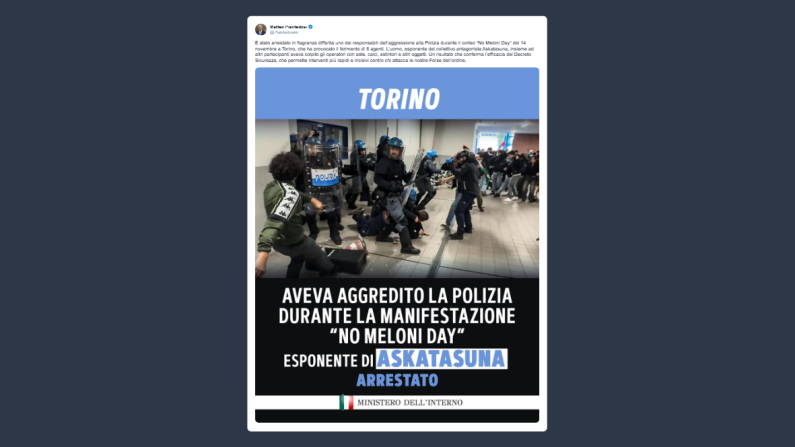 Il ministro dell’Interno, Matteo Piantedosi, ha scritto su X: «è stato arrestato in flagranza differita uno dei responsabili dell’aggressione alla Polizia durante il corteo “No Meloni day” del 14 novembre a Torino, che ha provocato il ferimento di 8 agenti. L’uomo, esponente del collettivo antagonista Askatasuna, insieme ad altri partecipanti aveva colpito gli operatori con aste, calci, estintori e altri oggetti. Un risultato che conferma l’efficacia del Decreto Sicurezza, che permette interventi più rapidi e incisivi contro chi attacca le nostre Forze dell’ordine».