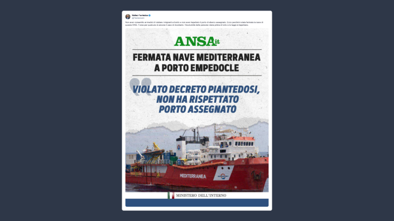 Il ministro dell’Interno, Matteo Piantedosi, ha commento su X il seguente articolo dell’Ansa: «fermata nave mediterranea a porto Empedocle. Violato decreto Piantedosi, non ha rispettato il porto assegnato».