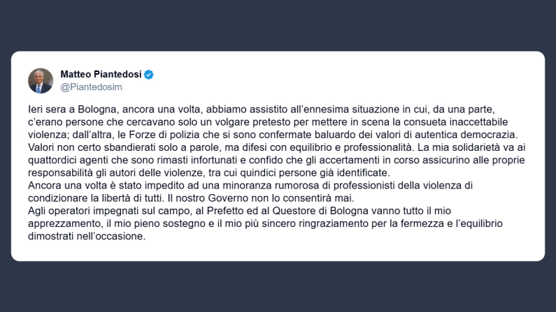 Il ministro dell’Interno, Matteo Piantedosi, ha scritto su X: «ieri sera a Bologna, ancora una volta, abbiamo assistito all’ennesima situazione in cui, da una parte, c’erano persone che cercavano solo un volgare pretesto per mettere in scena la consueta inaccettabile violenza, dall’altra, le Forze di Polizia che si sono confermate baluardo dei valori di autentica democrazia. Valori non certo sbandierati solo a parole, ma difesi con equilibrio e professionalità. La mia solidarietà va ai quattordici agenti che sono rimasti infortunati e confido che gli accertamenti in corso assicurino alle proprie responsabilità gli autori delle violenze, tra cui quindici persone già identificate. Ancora una volta è stato impedito ad una minoranza rumorosa di professionisti della violenza di condizionare la libertà di tutti. Il nostro Governo non lo consentirà mai. Agli operatori impegnati sul campo, al Prefetto ed al Questore di Bologna vanno tutto il mio apprezzamento, il mio pieno sostegno e il mio più sincero ringraziamento per la fermezza e l’equilibrio dimostrati nell’occasione».