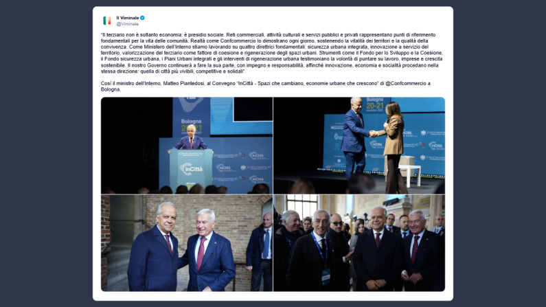 Il ministero dell’Interno ha scritto su X: «il terziario non è soltanto economia, è presidio sociale. Reti commerciali, attività culturali e servizi pubblici e privati rappresentano punti di riferimento fondamentali per la vita delle comunità. Realtà come Confcommercio lo dimostrano ogni giorno, sostenendo la vitalità dei territori e la qualità della convivenza. Come ministero dell’Interno stiamo lavorando su quattro direttrici fondamentali: sicurezza urbana integrata, innovazione a servizio del territorio, valorizzazione del terziario come fattore di coesione e rigenerazione degli spazi urbani. Strumenti come il fondo per lo sviluppo e la coesione, il fondo sicurezza urbana, i piani urbani integrati e gli interventi di rigenerazione urbana testimoniano la volontà di puntare su lavoro, imprese e crescita sostenibile. Il nostro Governo continuerà a fare la sua parte, con impegno e responsabilità, affinché innovazione, economia e socialità procedano nella stessa direzione, quella di città più vivibili, competitive e solidali».