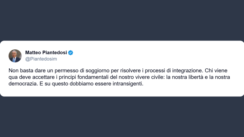 «Non basta dare un permesso di soggiorno per risolvere i processi di integrazione». Lo ha affermato il ministro dell’Interno, Matteo Piantedosi, in un post su X. «Chi viene qua deve accettare i principi fondamentali del nostro vivere civile: la nostra libertà e la nostra democrazia – ha evidenziato il ministro -. E su questo dobbiamo essere intransigenti».