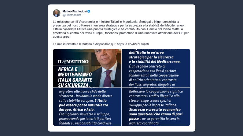 «La missione con il Vicepremier e ministro Tajani in Mauritania, Senegal e Niger consolida la presenza del nostro Paese in un’area strategica per la sicurezza e la stabilità del Mediterraneo. L’Italia considera l’Africa una priorità strategica e ha contribuito con il lancio del Piano Mattei a rimetterla al centro dei tavoli europei, facendosi promotrice di una rinnovata attenzione dell’UE per questa area».