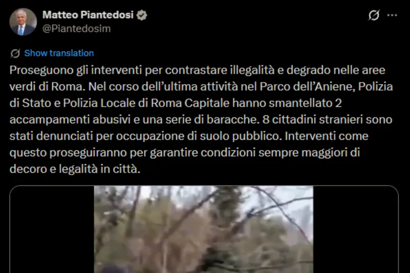 Piantedosi: Polizia smantella 2 accampamenti abusivi e una serie di baracche nelle aree verdi di Roma